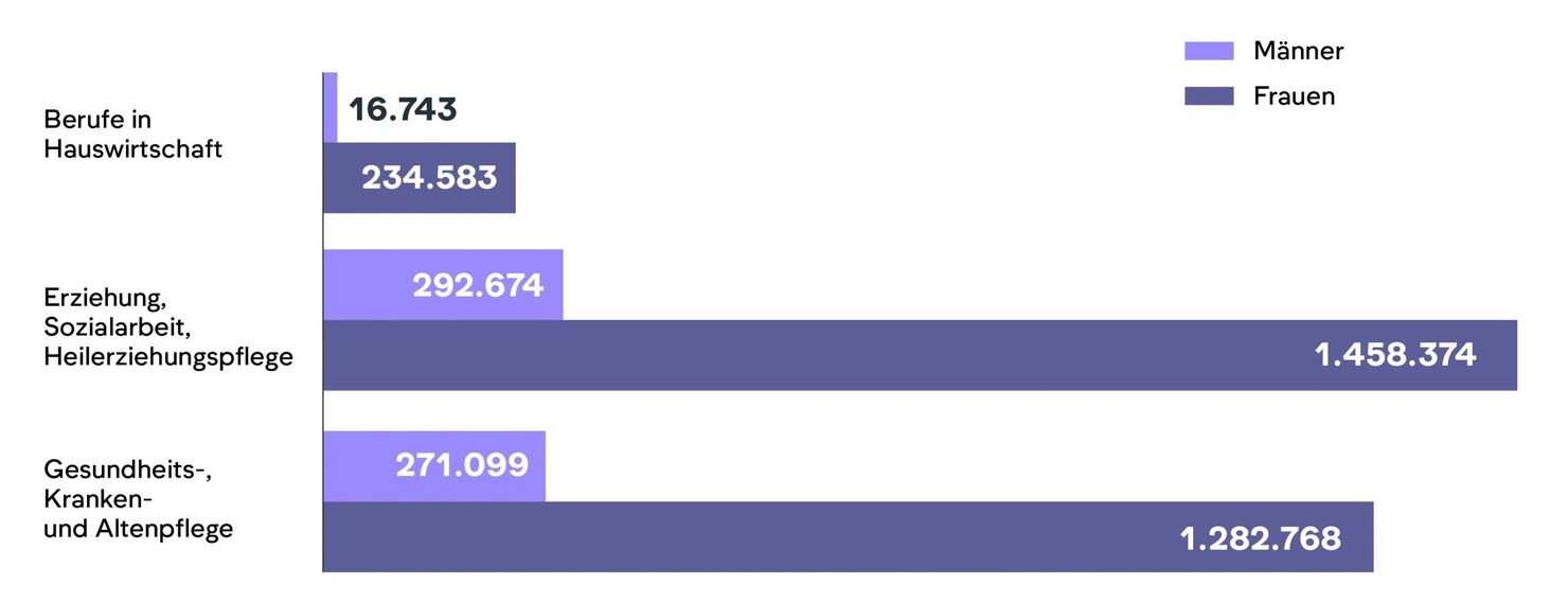 Abbildung 3: Sozialversicherungspflichtig Beschäftigte in ausgewählten Care-Berufen nach Geschlecht; Quelle: Bundesagentur für Arbeit (2023b); Stichtag 30.09.2022; eigene Darstellung