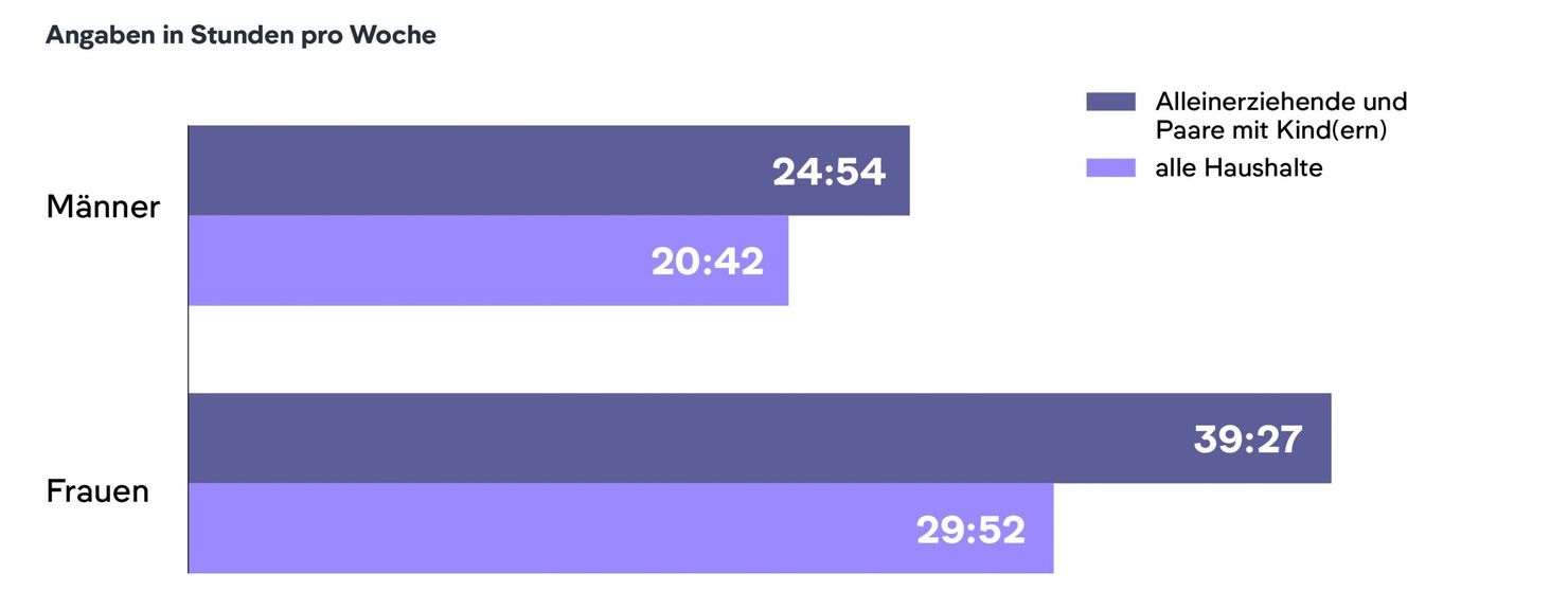 Abbildung 2: Verteilung bezahlter und unbezahlter Arbeit in Haushalten mit Kindern; Quelle: Destatis 2024; Datengrundlage ist die Zeitverwendungserhebung (2022); eigene Darstellung