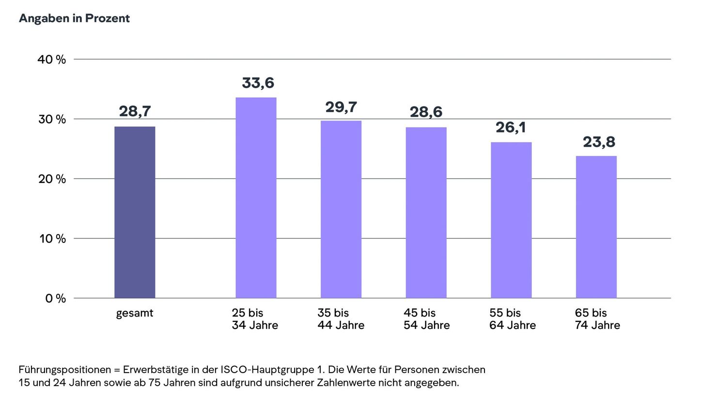 Abbildung 2: Anteile von Frauen in Führungspositionen insgesamt und nach Altersgruppen in Deutschland; Quelle: Statistisches Bundesamt (2024d); Datengrundlage ist die Arbeitskräfteerhebung 2023; eigene Darstellung