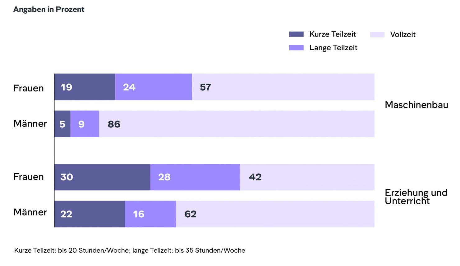 Abbildung 3: Frauen und Männer in Vollzeit, langer Teilzeit und kurzer Teilzeit in den Branchen „Maschinenbau“ und „Erziehung und Unterricht“; Quelle: Pfahl et al. 2023: 32 f.; Datengrundlage ist der Mikrozensus 2021; eigene Darstellung
