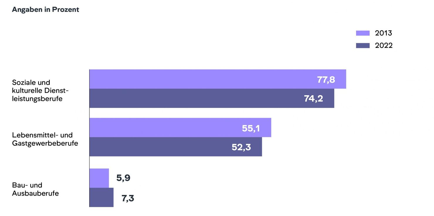 Abbildung 1: Frauenanteil an den sozialversicherungspflichtigen Beschäftigten in ausgewählten Berufen in Deutschland; Quelle: Pfahl/Wittmann (2023: 3); Datengrundlage sind die Berufe im Spiegel der Statistik des Instituts für Arbeitsmarkt- und Berufsforschung; eigene Darstellung