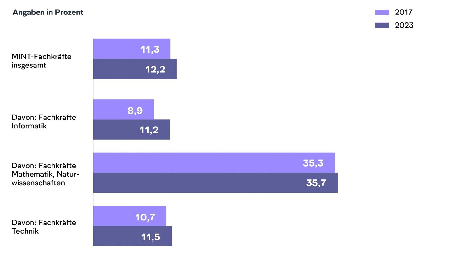 Abbildung 5: Frauenanteile in Prozent an neu abgeschlossenen Ausbildungsverträgen zum 30.09. in dualen MINT-Berufen in Deutschland; Quelle: Bundesagentur für Arbeit (2024); Datengrundlage ist die Statistik der Bundesagentur für Arbeit; eigene Darstellung