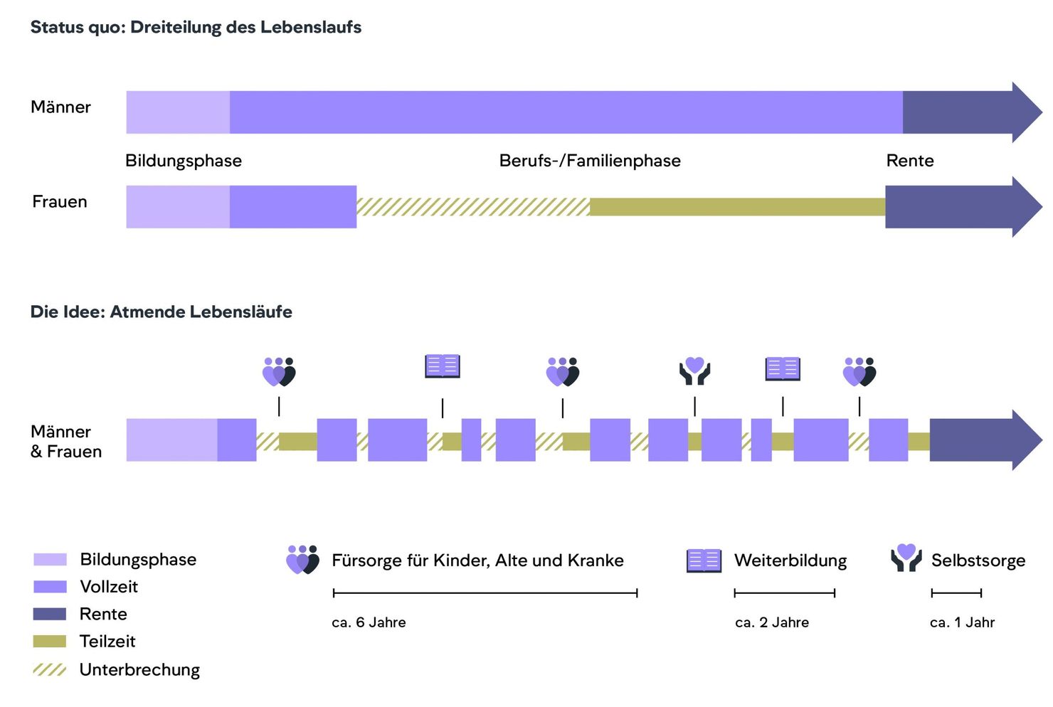Zahlreiche Initiativen und Reformvorschläge adressieren diese Probleme unter dem Stichwort der „Zeitpolitik“. Sie setzen sich dafür ein, dass Menschen mehr Zeit haben für Sorgetätigkeiten, Weiterbildung, kulturelle Aktivitäten oder politische Teilhabe. Bereits 2017 plädierte die Sachverständigenkommission für den Zweiten Gleichstellungsbericht der Bundesregierung für eine Abkehr vom „Normalarbeitsverhältnis“ hin zu einem „Erwerbs-Sorge-Modell“ (Bundesregierung 2017: 57; 101 ff.). Ein solches Modell soll es allen Menschen, unabhängig vom Geschlecht, ermöglichen, Erwerbsarbeit, private Sorgetätigkeiten und andere gesellschaftlich notwendige Aktivitäten unter einen Hut zu bekommen (ebd.: 13 f.).